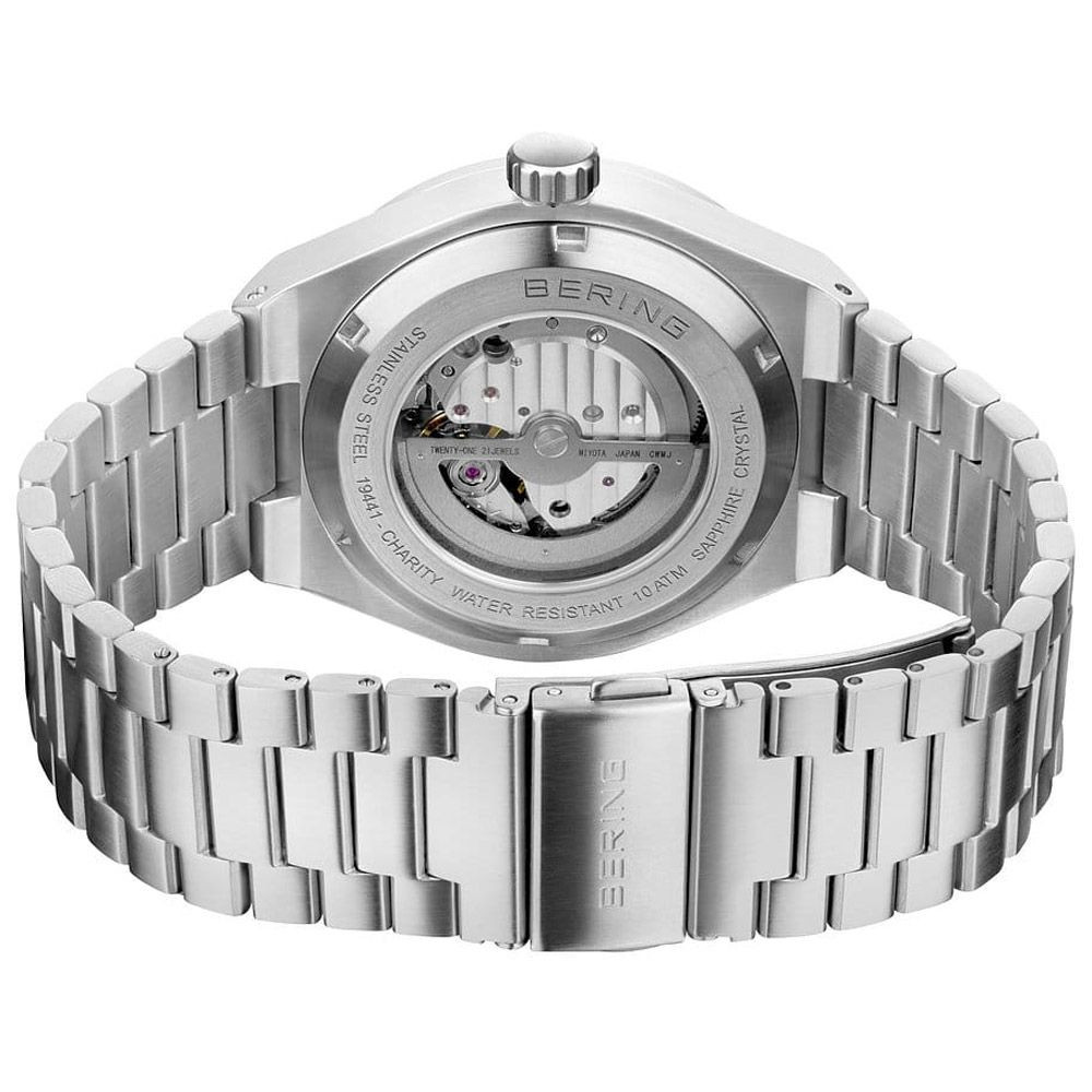 Das Material des Uhrengehäuses von Bering Automatic Herrenuhr 19441-CHARITY ist Edelstahl, seine Farbe ist Silber, das Material des Armbandes ist Edelstahl und seine Farbe ist Silber. Der Durchmesser des Uhrengehäuses beträgt 41 mm, seine Form ist Rad. Das Glas der Uhr ist Saphir (kratzfrei), ihr Mechanismus ist Automatisch und ihre Wasserdichtigkeit ist 10 atm (100 m) (zum Schwimmen geeignet).