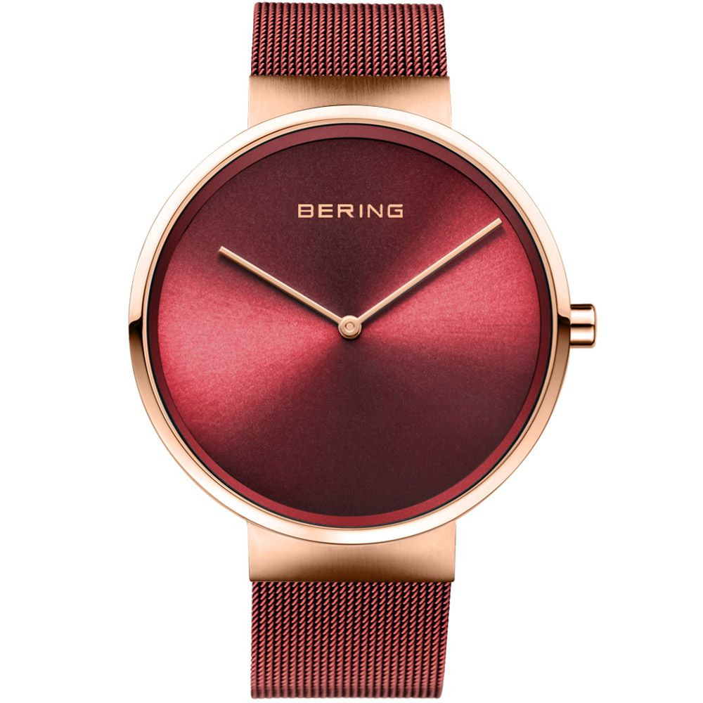 Das Material des Uhrengehäuses von Bering Classic Damenuhr 14539-363 ist Edelstahl, seine Farbe ist Roségold, das Material des Armbandes ist Edelstahl und seine Farbe ist Rot. Der Durchmesser des Uhrengehäuses beträgt 39 mm, seine Form ist Rad. Das Glas der Uhr ist Saphir (kratzfrei), ihr Mechanismus ist Quarz und ihre Wasserdichtigkeit ist 5 atm (50 m) (sehr sturzsicher).