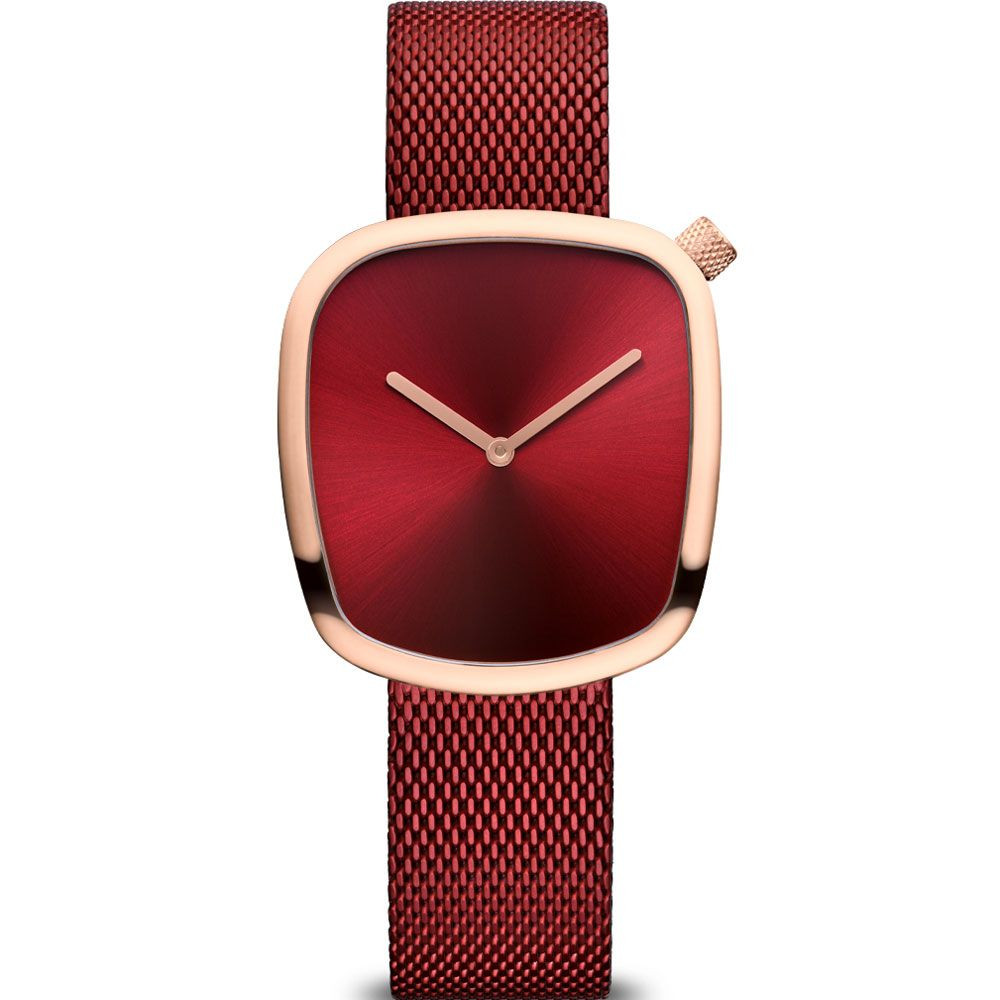 Das Material des Uhrengehäuses von Bering Classic Pebble Damenuhr 18034-363 ist Edelstahl, seine Farbe ist Roségold, das Material des Armbandes ist Edelstahl und seine Farbe ist Rot. Der Durchmesser des Uhrengehäuses beträgt 34 mm, seine Form ist Elliptisch. Das Glas der Uhr ist Kristall (schwer zu zerkratzen), ihr Mechanismus ist Quarz und ihre Wasserdichtigkeit ist 3 atm (30 m) (tropffrei).