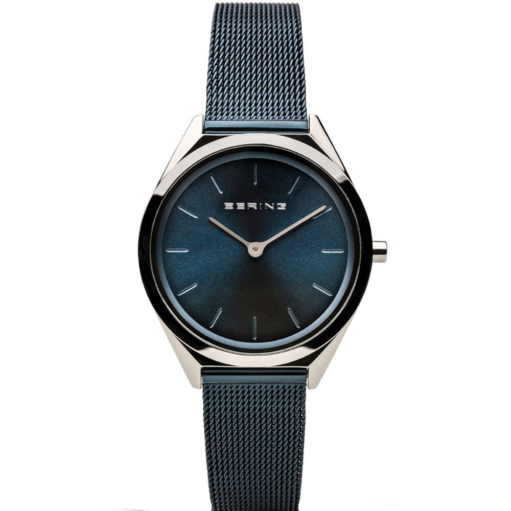 Das Material des Uhrengehäuses von Bering Ultra Slim Damenuhr 17031-307 ist Edelstahl, seine Farbe ist Silber, das Material des Armbandes ist Edelstahl und seine Farbe ist Blau. Der Durchmesser des Uhrengehäuses beträgt 31 mm, seine Form ist Rad. Das Glas der Uhr ist Saphir (kratzfrei), ihr Mechanismus ist Quarz und ihre Wasserdichtigkeit ist 3 atm (30 m) (tropffrei).