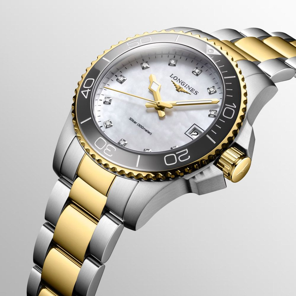 Das Material des Uhrengehäuses von Longines HydroConquest Damenuhr L3.370.3.87.6 ist Edelstahl, seine Farbe ist Arany,Ezüst, das Material des Armbandes ist Edelstahl und seine Farbe ist Arany,Ezüst. Der Durchmesser des Uhrengehäuses beträgt 32 mm, seine Form ist Rad. Das Glas der Uhr ist Saphir (kratzfrei), ihr Mechanismus ist Quarz und ihre Wasserdichtigkeit ist 30 atm (300 m) (zum Tauchen geeignet).