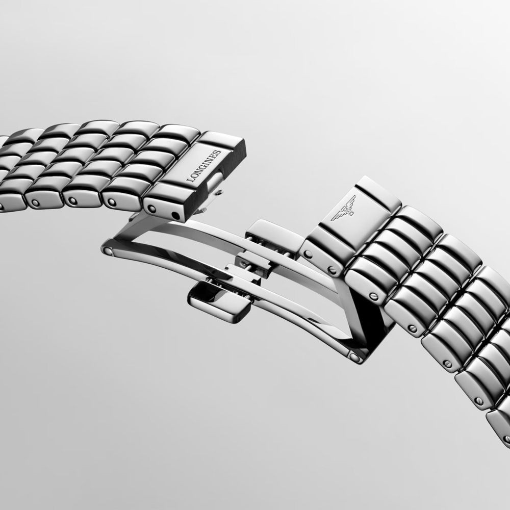 Das Material des Uhrengehäuses von Longines Mini Dolcevita Damenuhr L5.200.0.75.6 ist Edelstahl, seine Farbe ist Silber, das Material des Armbandes ist Edelstahl und seine Farbe ist Silber. Der Durchmesser des Uhrengehäuses beträgt 22 mm, seine Form ist Quadrat. Das Glas der Uhr ist Saphir (kratzfrei), ihr Mechanismus ist Quarz und ihre Wasserdichtigkeit ist 3 atm (30 m) (tropffrei).